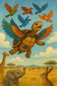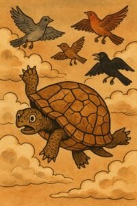 When the day came, the tortoise joined them in flight, soaring through the sky for the first time. As they flew, the tortoise had another idea. “Let’s all take new names, just for today,” he suggested. The birds agreed. One called herself Sky-Dancer, another chose Feather-Bright, and the tortoise said, “I shall be called… All of You.” The birds were none the wiser. Upon arriving at the sky feast, the sky people welcomed them warmly: “You are all welcome. This food is for all of you.” The tortoise stepped forward, proud: “Ah yes, that is *me*. My name is All of You. So this feast is for me alone.” He ate every crumb.