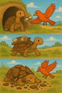 The tortoise’s story teaches us about the cost of greed. His cleverness was overshadowed by selfishness. In trying to outwit everyone, he lost more than just a meal—he lost his trust, his pride, and the beauty of his once-smooth shell. Wisdom isn’t just being smart—it’s knowing when enough is enough.